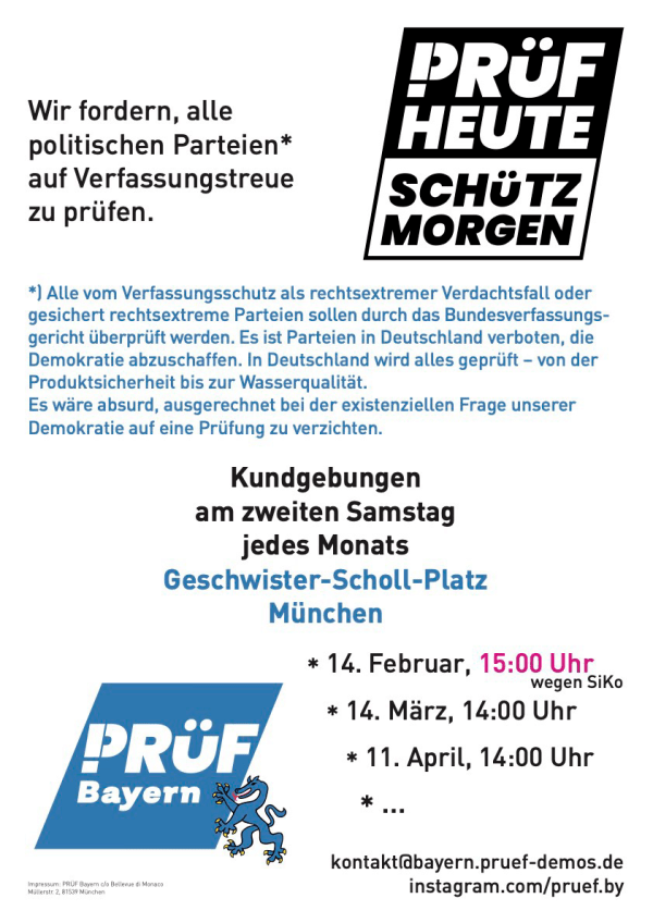 Prüf-Bayern: Die Demonstrationen für eine verfassungsgemäße Überprüfung der Parteien – nächste in #München am Sa 14.2.26 diesmal 15h am Geschwister-Scholl-Platz vor der Uni